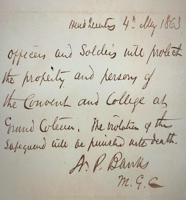 In 1862 General Nathaniel Prentice Banks became the commander of the Department of the Gulf. He and his wife Mary Theodosia Palmer Banks had a daughter in a Sacred Heart school at Manhattanville, New York.